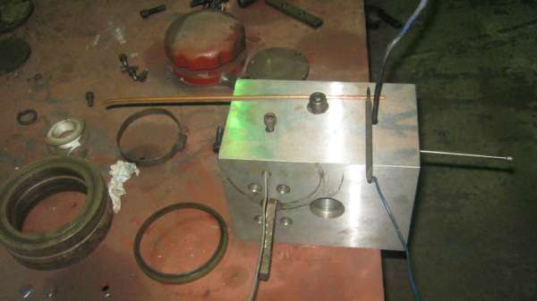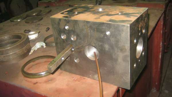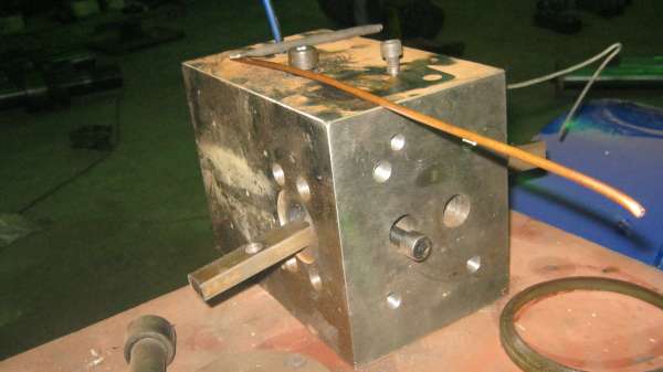 阀板上平面插镙丝的孔,向下打到底,接低压油,要把它引到右端插白铁条的孔里,铜管,焊条,竖插棍,都是它的工艺孔了,设计得怎么这么蠢,大爷的。把插镙丝孔向中间挪点,右端白铁条孔打深点,不就把低压油引来了嘛。 |