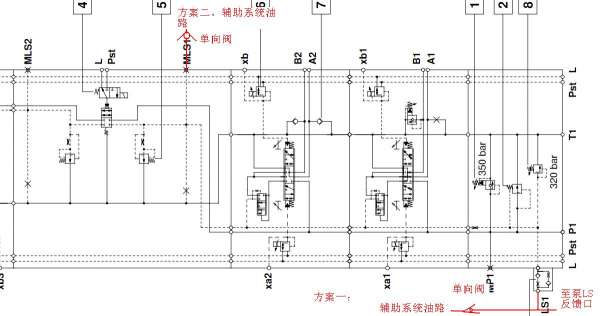 2、 辅助系统的压力反馈油路接M7阀MLS1油口,再通过三通接到A8VO140的恒压阀LS反馈口。主系统不动作,辅助系统执行机构速度变快了。