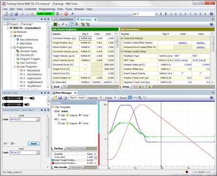RMC75和RMC150控制器对于每个轴都有一个内置的液压缸模拟器。通过它用户可以模拟和设置液压缸的增益、固有频率和阻尼因子,以使执行器液压缸按照开环和闭环的切实控制信号作出响应。这里的液压缸增益、固有频率和阻尼因子等参数应该来自于液压设计师。模拟器的模型如下: T(s)=Kωn 2/(s (s2+2ζωns+ Kωn2)) 其中: T(s) 为液压执行器的开环模式 s 为拉普拉斯Laplace算子 K 为以毫米/秒、每增加1%控制的液压增益 ζ 为阻尼因子 ωn 为液压缸和载荷的固有频率 对于力控制的应用,RMC模拟液压执行机构对硬弹簧的推压。