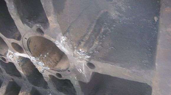 真正要补焊的,指要重镗的,就是曲臂孔。因为曲臂孔的设计余量不足,所以不好把孔再镗大了,镗之前要补焊。  这个力劲机虽是球铁,无法补焊,但它也有好处,就是力劲的曲臂一般不要重镗,它设计强度高孔不变形,无需重镗,自然也就不要补焊了。补焊是为了重镗。