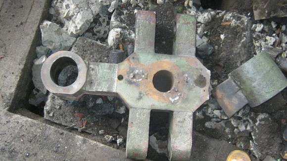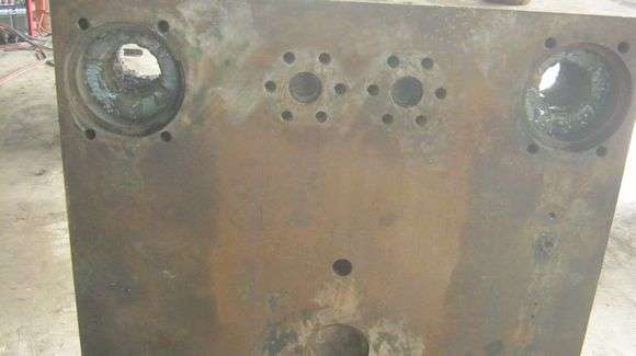 图上是小吨位的曲臂孔,补焊时注意,我指处那个台阶,不要焊上,一来减少补焊量,二来重铣那个面时,留个基准。我们有加工好的大板,大杠穿不上,就是那个基准没留,镗床加工厂家也未必有图纸,就随意铣了那个面,造成大板跑位,大杠穿不上。