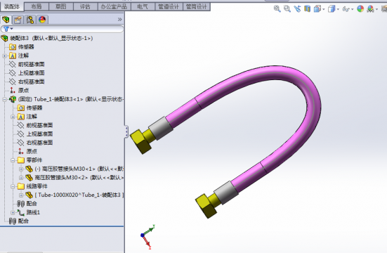 需要先建接头,添加连接点和线路点,建胶管模型。注意连接点参数和胶管模型的通径要匹配。可以用solidworks自带的库零件编辑器进行接头和胶管的设计。这些都准备好了以后就可以用routing模块进行胶管设计了。直接插入零件自动链接胶管,再插入另一个接头,最后使用自动步路连接两点就可以了。